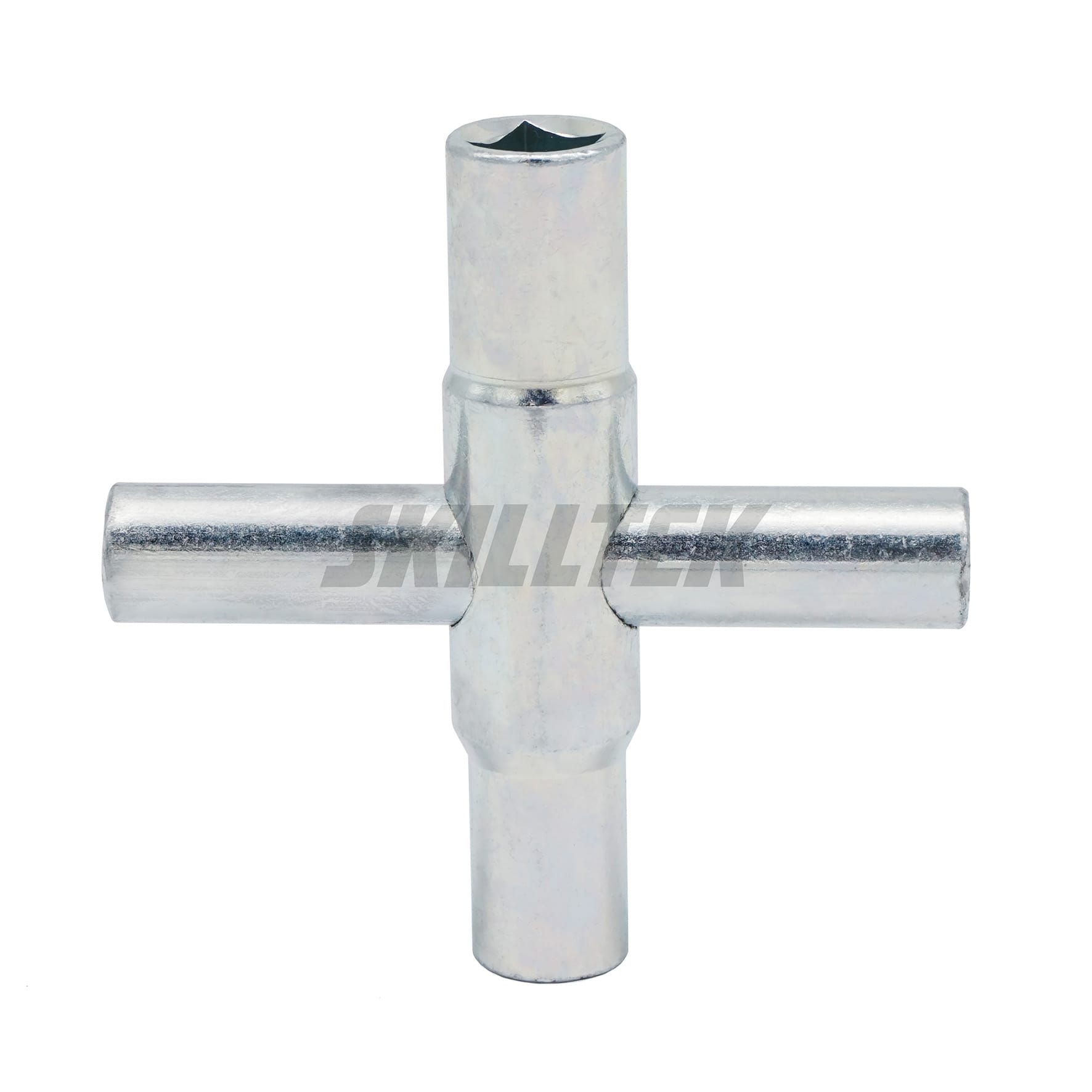 The 4-Way Sillcock Key is a versatile hand tool designed for opening and closing sillcock valves, water spigots, and utility access points. Made of durable metal with a corrosion-resistant silver finish, it provides strength and longevity for both professional and everyday use. Each arm features a different socket size—1/4″, 9/32″, 5/16″, and 11/32″—making it compatible with most standard sillcock and hose bib valves. The cross-shaped design allows excellent leverage and control, even in tight or recessed spaces. This compact, lightweight tool (160 g) is ideal for plumbing, maintenance, HVAC, and construction work. In addition, the surface can be laser-engraved with a customized logo for branding or promotional use.